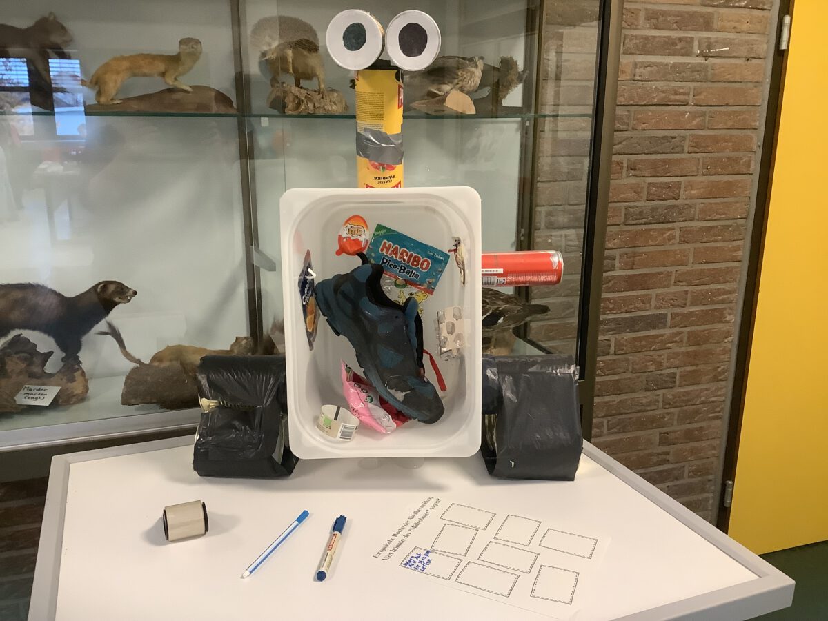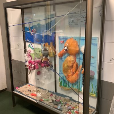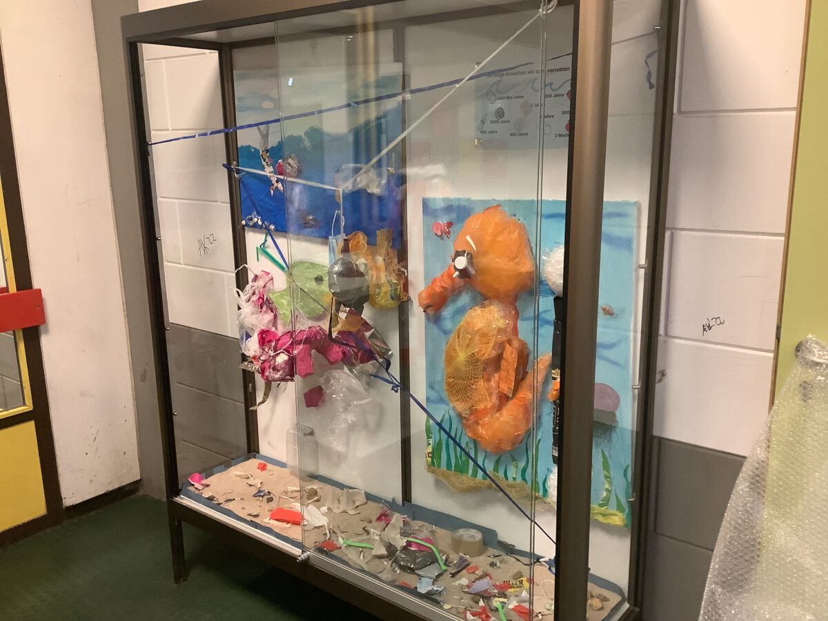 Die Sichtbarkeit der Woche der Abfallvermeidung wurde, neben Plakaten und Durchsagen, durch Kunstwerke aus dem DG-Unterricht hergestellt. Das Plastikmeer im Schaukasten auf der Biologieetage regt noch weiter zum Nachdenken an.