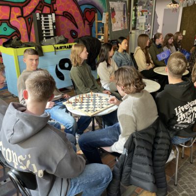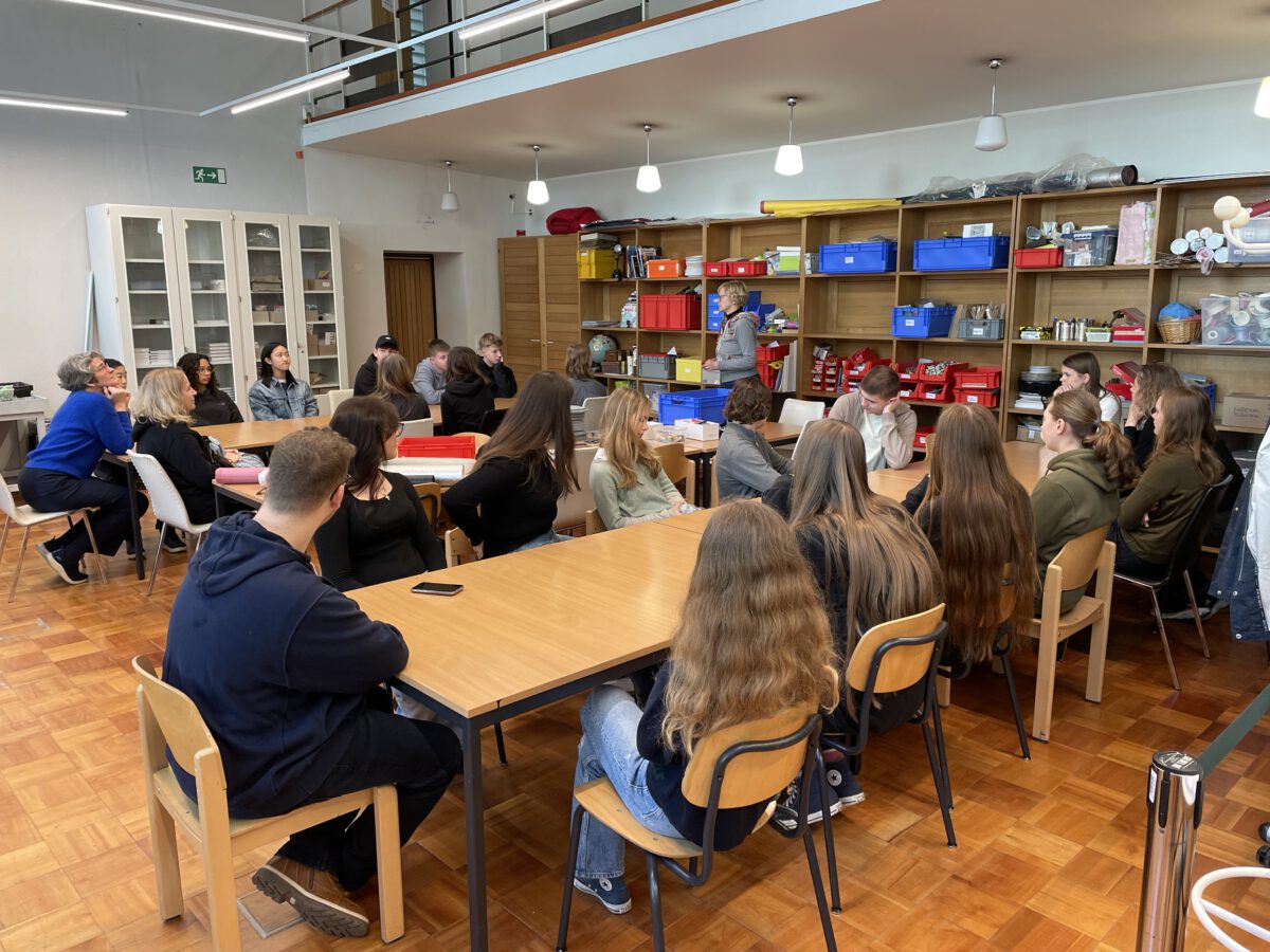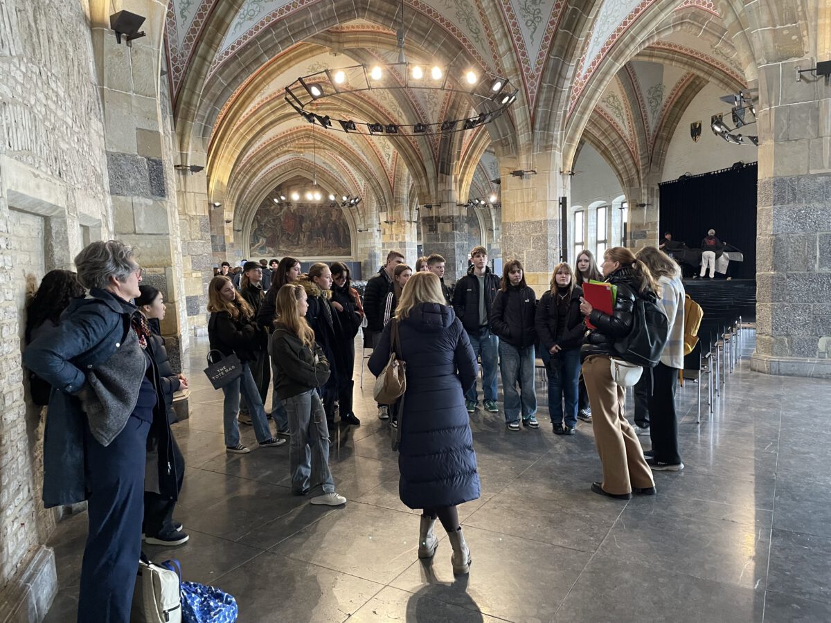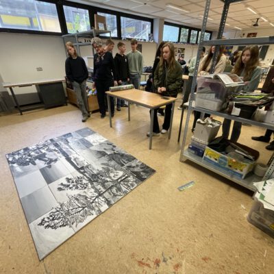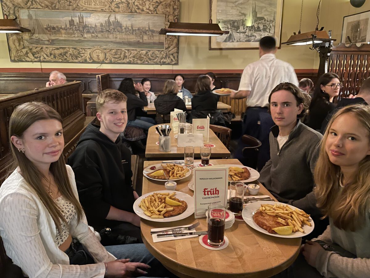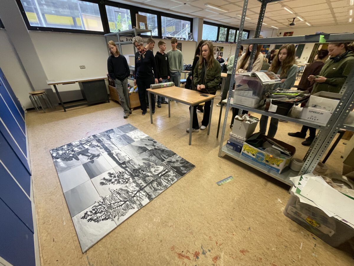 Die SchülerInnen zweier unterschiedlicher Länder zusammenzubringen ist keine Kunst. Doch mit Kunst geht es besser. Unter diesem Motto trafen sich die Erasmus+ – Austauschgruppen aus Stockholm und Langerwehe jetzt schon zum vierten Mal – zweimal in Schweden und nun auch das zweite Mal im Rheinland. Dabei ist Kunst ein dehnbarer Begriff und kann auf vielfältige Art und Weise zu spannenden und verbindenden Aktivitäten führen. Die erste war praktischer Natur, wobei ‚Natur‘ auch das Thema war: Gemeinsam malten SchülerInnen und LehrerInnen eine typische schwedische Landschaft in schwarz-weiß. Der Clou dabei war, dass alle einen Ausschnitt eines noch unbekannten Gesamtbildes malen mussten, welches erst ganz zum Schluss zusammengefügt wurde und so die einzelnen Leinwände einen Sinn bekamen. Auch am zweiten Tag des Besuchs, der komplett in Köln stattfand, stand die Kreativität im Vordergrund: Vormittags ging es ins MAKK, dem Museum für angewandte Kunst, wo ein Workshop zum Thema ‚Ananas mal anders! – Gestalten mit veganem Lederersatz‘ die deutschen und schwedischen SchülerInnen herausforderte; nachmittags – nach einem wohlverdienten Mittagessen im Brauhaus – stand ‚Deutsch lernen mit Kunst‘ im Museum Ludwig auf dem Programm. Den dritten Tag verbachten die Schweden alleine in Bonn, besuchten dort das Haus der Geschichte, bevor sich alle abends noch zum gemeinsamen Bowling wiedertrafen. Die anderthalb verbleibenden Tage verbrachten alle in der Schule und die SchwedInnen hospitierten im Unterricht der deutschen GastschülerInnen. Dies wurde nur von zwei Abstechern unterbrochen, einmal durch eine Wanderung zum Indemann und dann noch von einem Workout an der schuleigenen Kletterwand, an dem eine andere Kunst, die des Kletterns, erprobt werden konnte.