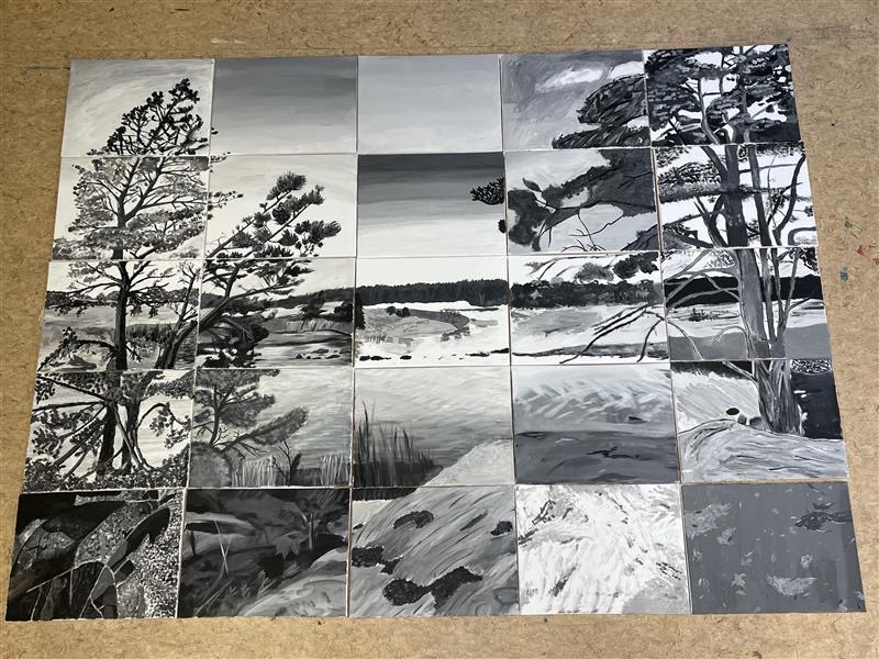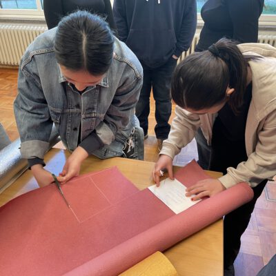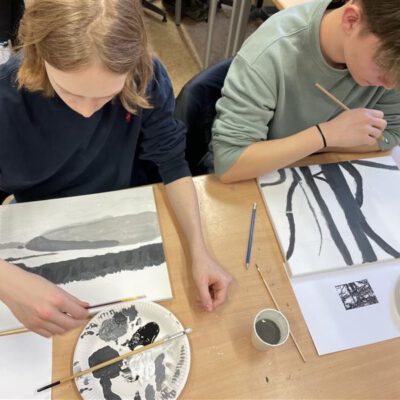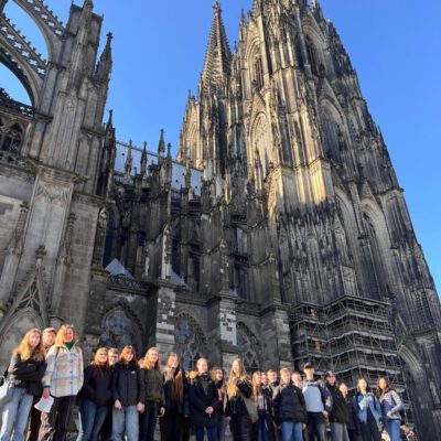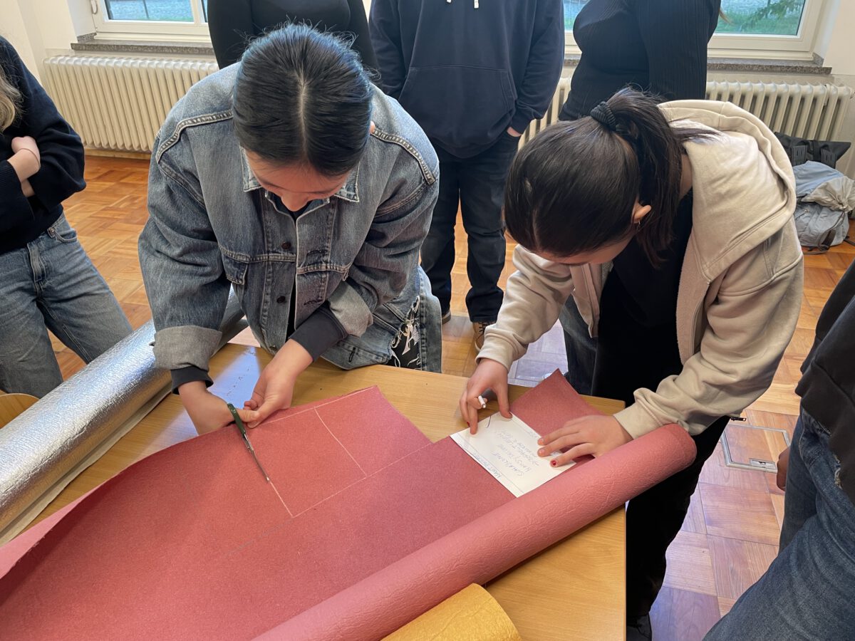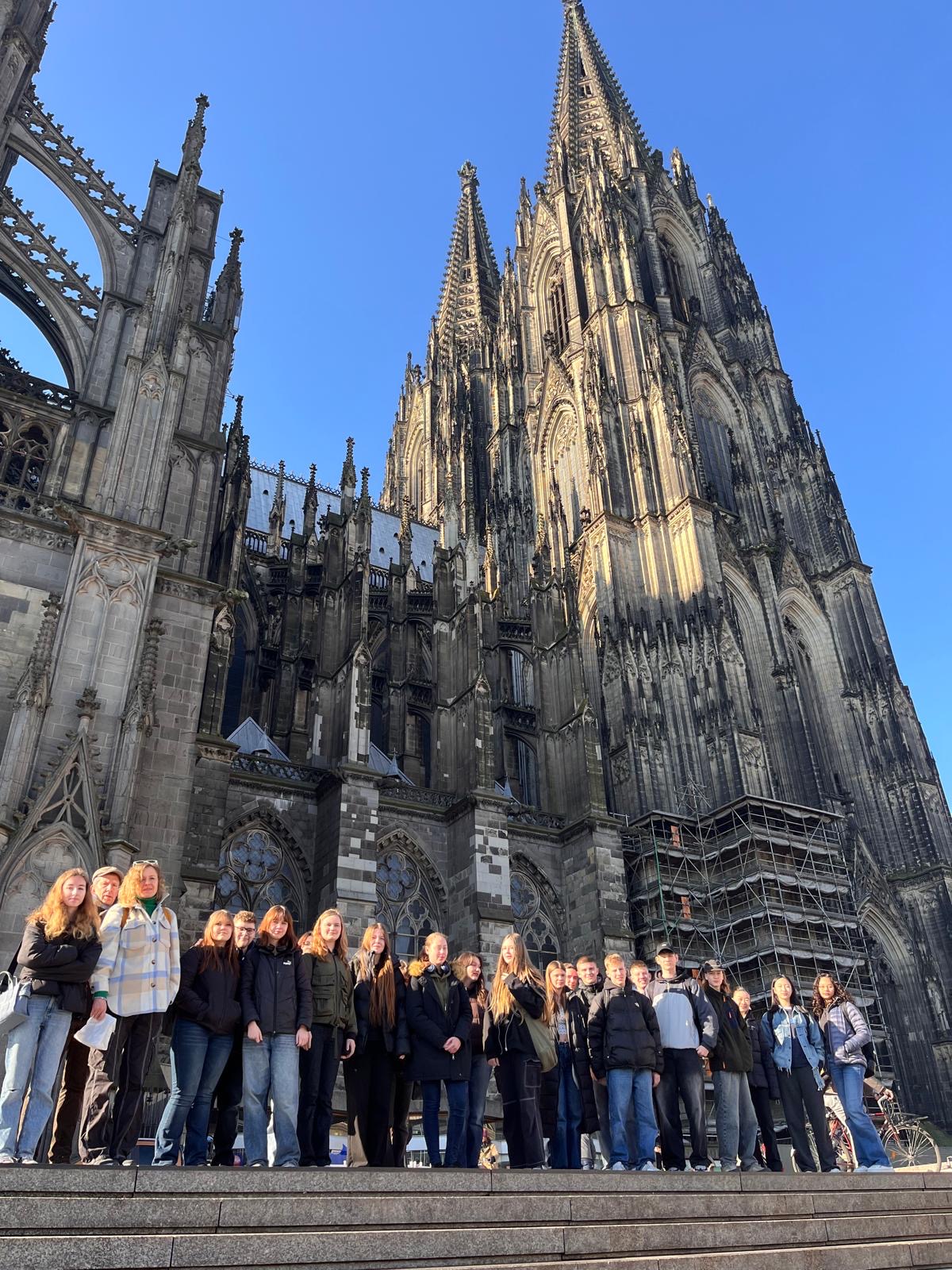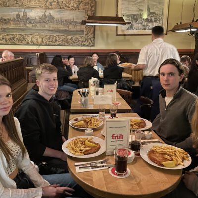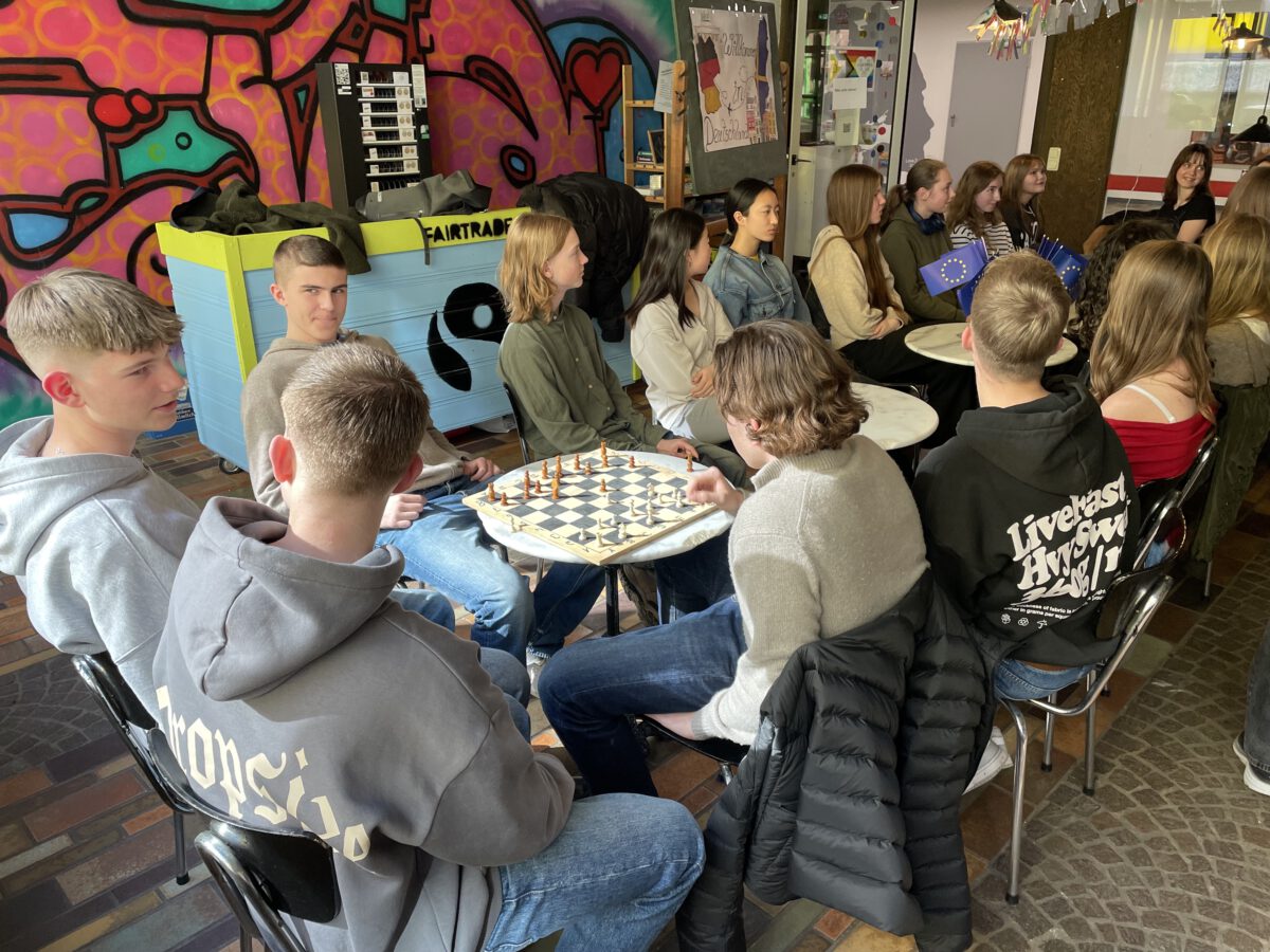 Die SchülerInnen zweier unterschiedlicher Länder zusammenzubringen ist keine Kunst. Doch mit Kunst geht es besser. Unter diesem Motto trafen sich die Erasmus+ – Austauschgruppen aus Stockholm und Langerwehe jetzt schon zum vierten Mal – zweimal in Schweden und nun auch das zweite Mal im Rheinland. Dabei ist Kunst ein dehnbarer Begriff und kann auf vielfältige Art und Weise zu spannenden und verbindenden Aktivitäten führen. Die erste war praktischer Natur, wobei ‚Natur‘ auch das Thema war: Gemeinsam malten SchülerInnen und LehrerInnen eine typische schwedische Landschaft in schwarz-weiß. Der Clou dabei war, dass alle einen Ausschnitt eines noch unbekannten Gesamtbildes malen mussten, welches erst ganz zum Schluss zusammengefügt wurde und so die einzelnen Leinwände einen Sinn bekamen. Auch am zweiten Tag des Besuchs, der komplett in Köln stattfand, stand die Kreativität im Vordergrund: Vormittags ging es ins MAKK, dem Museum für angewandte Kunst, wo ein Workshop zum Thema ‚Ananas mal anders! – Gestalten mit veganem Lederersatz‘ die deutschen und schwedischen SchülerInnen herausforderte; nachmittags – nach einem wohlverdienten Mittagessen im Brauhaus – stand ‚Deutsch lernen mit Kunst‘ im Museum Ludwig auf dem Programm. Den dritten Tag verbachten die Schweden alleine in Bonn, besuchten dort das Haus der Geschichte, bevor sich alle abends noch zum gemeinsamen Bowling wiedertrafen. Die anderthalb verbleibenden Tage verbrachten alle in der Schule und die SchwedInnen hospitierten im Unterricht der deutschen GastschülerInnen. Dies wurde nur von zwei Abstechern unterbrochen, einmal durch eine Wanderung zum Indemann und dann noch von einem Workout an der schuleigenen Kletterwand, an dem eine andere Kunst, die des Kletterns, erprobt werden konnte.