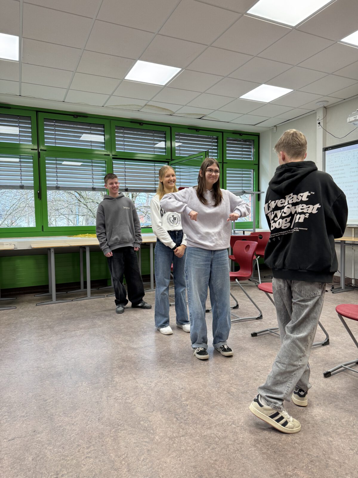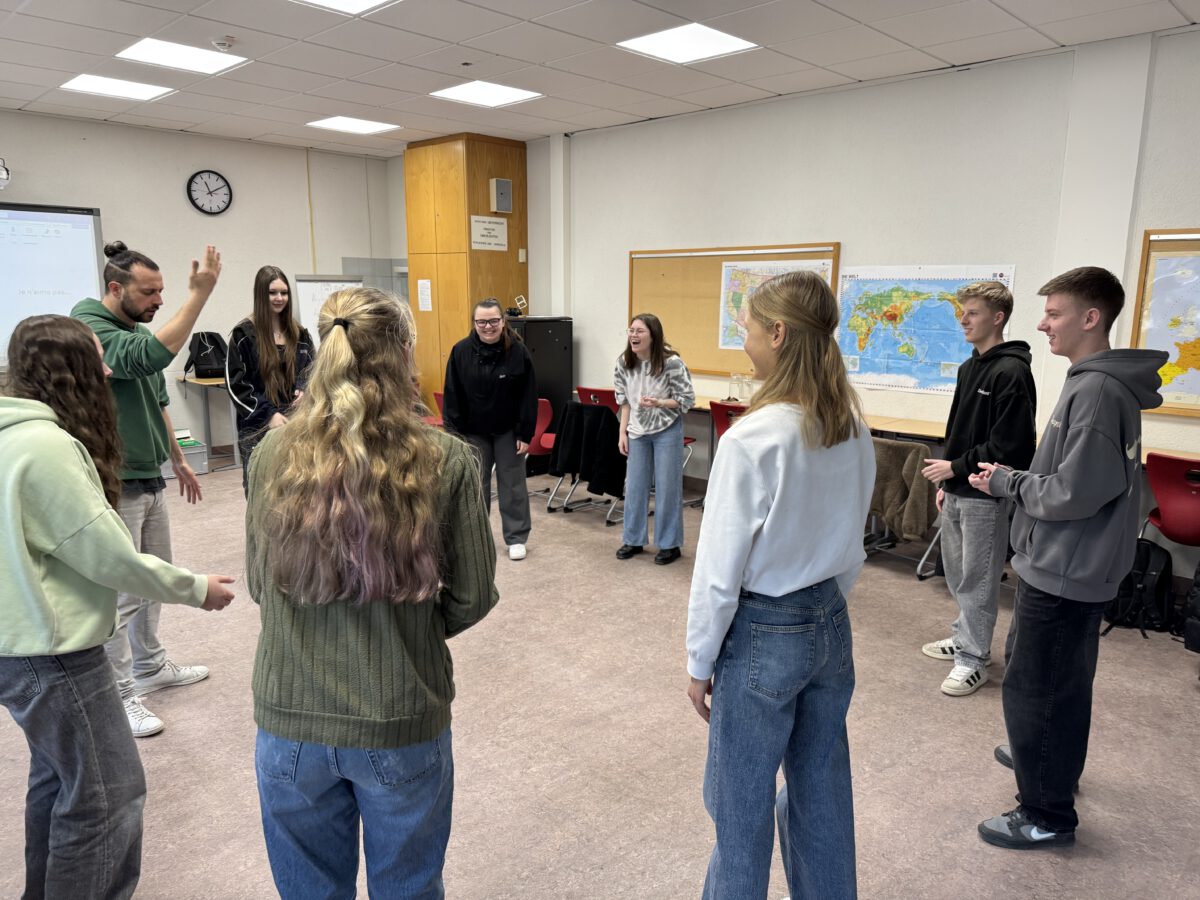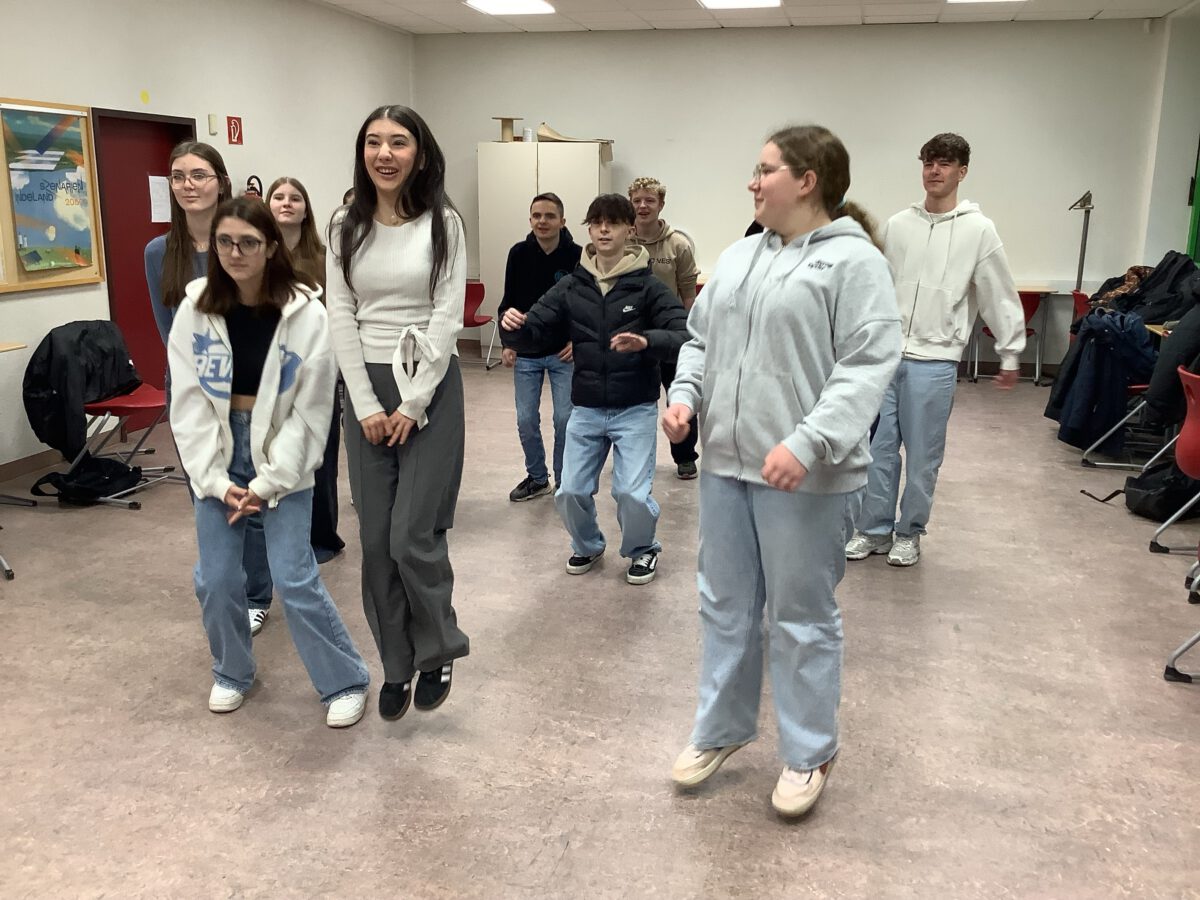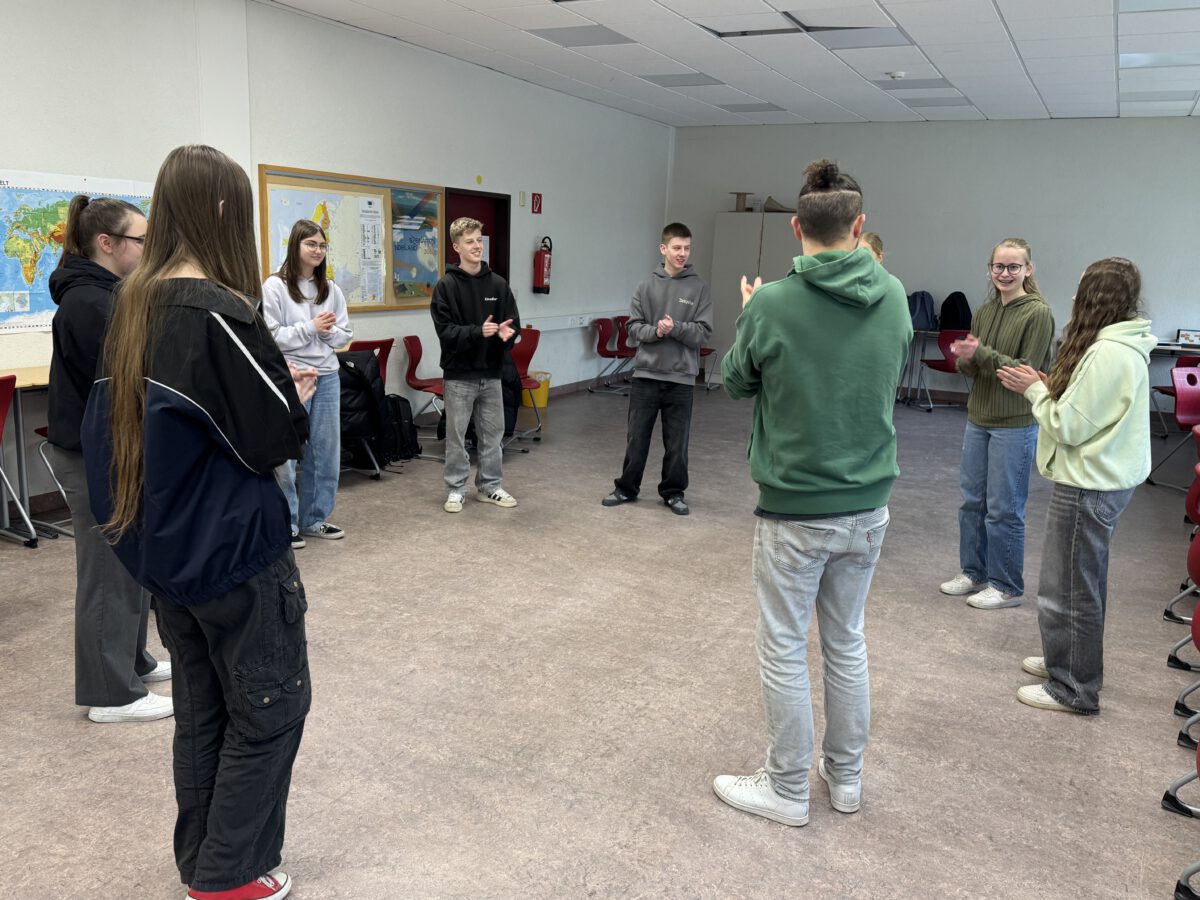 Trotz mehrjährigen Sprachenlernens ist die Hürde hoch, auf Französisch zu sprechen oder gar zu improvisieren. Dass dies aber durchaus gelingen kann und sogar Spaß macht, erfuhren die Französisch Lernenden der Jahrgänge 10 und 11 der Europaschule Langerwehe im Rahmen eines Theaterworkshop mit Vincent Simon. Der gebürtige Bretone und Wahlberliner weiß, wie er Schülerinnen und Schüler dazu bringt, in einem spielerischen Rahmen ihre Hemmschwellen zu überwinden und dabei ihre Sprachkenntnisse in einer Vielzahl verschiedener szenischer Spiel- und Darstellungsformen anzuwenden. In Kleingruppen stellten die Nachwuchsschauspieler- und schauspielerinnen Gefühle in unterschiedlicher Intensität dar, entwickelten kleine Sketche nach Vorgaben und lernten nebenher viele neue französische Wörter und Formulierungen. Alle waren sich am Ende einig: «C’était bien!» und «Vincent, vous êtes trop cool!»