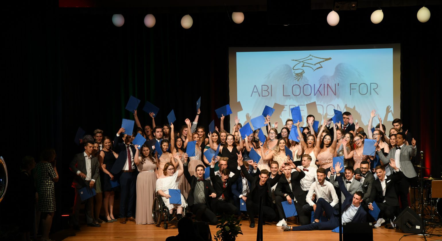 Am Ende der vorletzten Schulwoche vor den Sommerferien fand in der Festhalle Weisweiler die Entlassfeier für die Jahrgangsstufe Q2 unter dem selbstgewählten Motto „Abi lookin‘ for Freedom“ statt. Wie am Tag zuvor bei der Feier der Jahrgangsstufe 10 hatten die Schüler zusammen mit ihren Lehrern ein tolles Programm auf die Beine gestellt, durch das die Moderatoren Halime Ramadani und Elias Zakowski das zahlreich erschienene Publikum mit witzigen Beiträgen und Kommentaren führten.