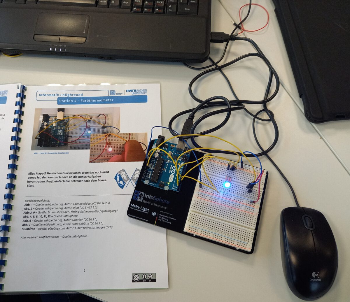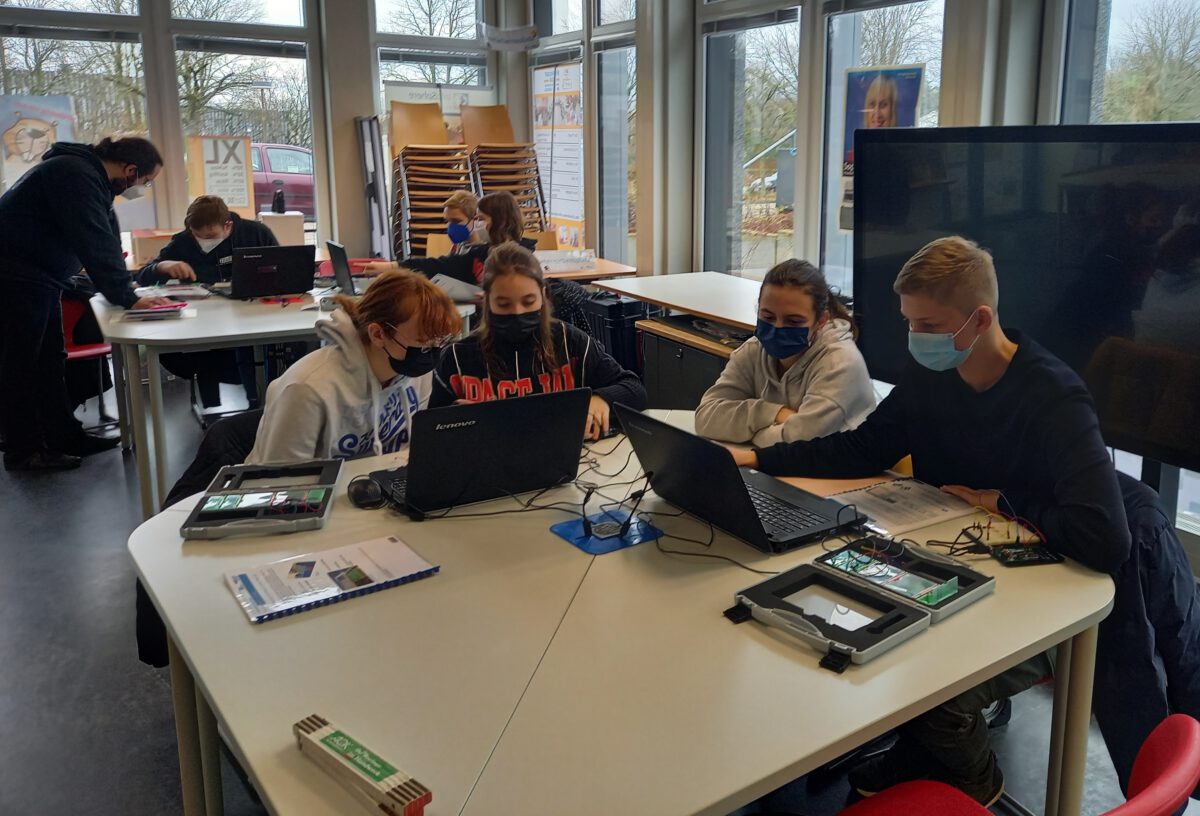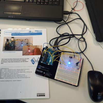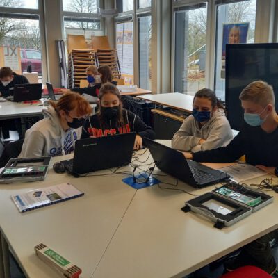 Auch die SchülerInnen und Schüler der diesjährigen Junior Ingenieur Akademie (JIA) (Jg. 9) konnten in diesem Schuljahr 2021/22 wieder eine ihrer obligatorischen JIA-Exkursionen zum Schülerlabor InfoSphere durchführen. In dem von der JIA belegten Workshop ging es unter anderem um die Programmierung von Ampelschaltungen, Farbthermometer oder Einparkhilfen. Die Schülerinnen und Schüler lernten hier unter Anwendung der Arduino-Mikrocontrollerplattform die Grundlagen textueller Programmierung kennen, um z.B. LEDs zum Leuchten zu bringen oder Temperatur -oder Bewegungs-Sensoren zu steuern. Ihre neu erworbenen Kenntnisse nutzten die JIA-SchülerInnen und Schüler nach der Exkursion für ihre anschließenden JIA-Projektarbeit mit dem Arduino-Mikrocontroller in der Schule. Dabei haben sie zum einen die verschiedenen im Schülerlabor vorgestellten Arduino-Projekte weiterbearbeitet und zum anderen aber auch neue eigene kreative Projekte entwickelt und durchgeführt.