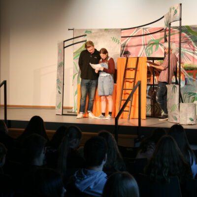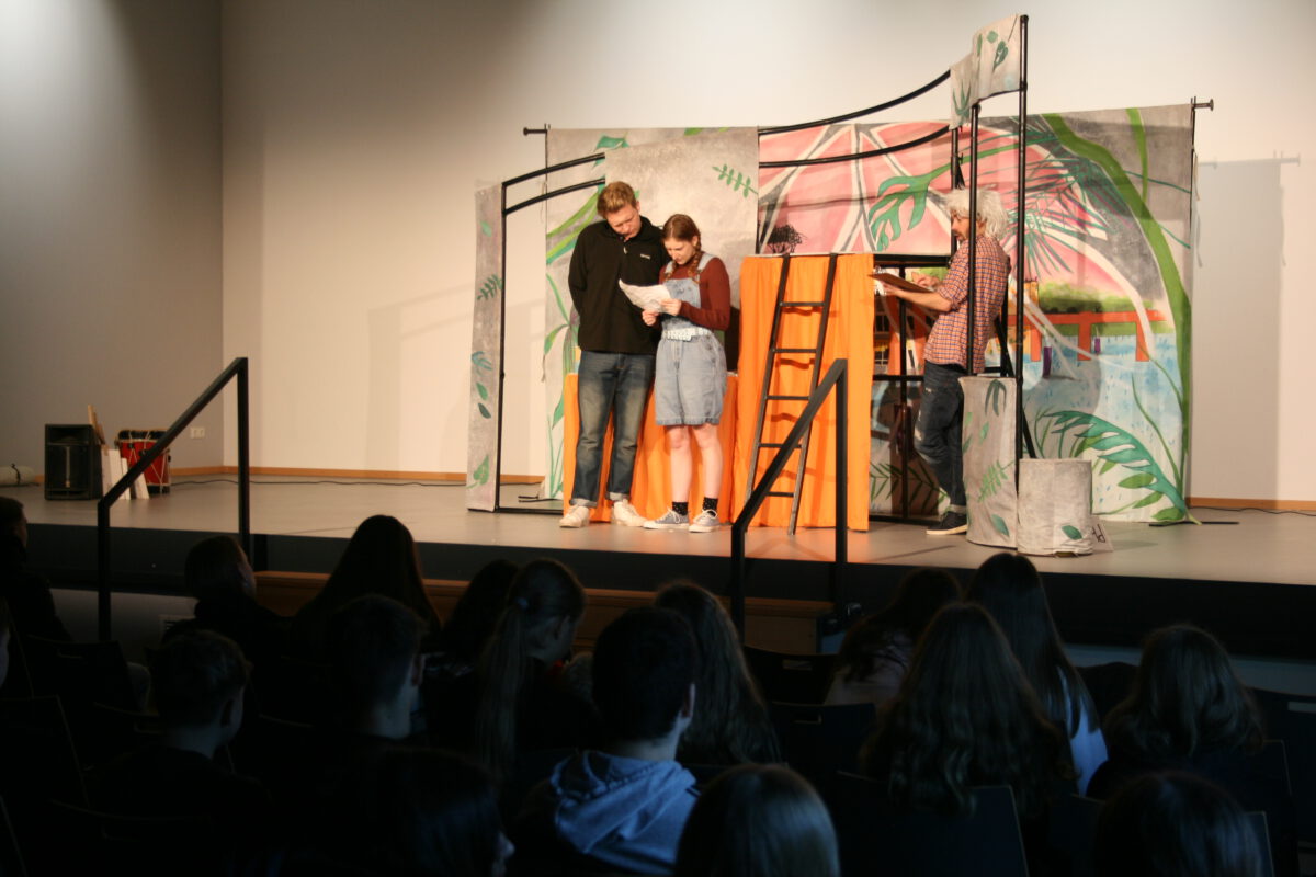 Die Schüler und Schülerinnen der Jahrgangsstufen 6, 7, 9 und 10 verfolgten gespannt die turbulenten Geschehnisse auf der Bühne der neuen Aula und freuten sich über die kurzweilige Unterhaltung in englischer Sprache.