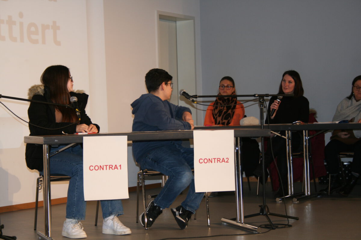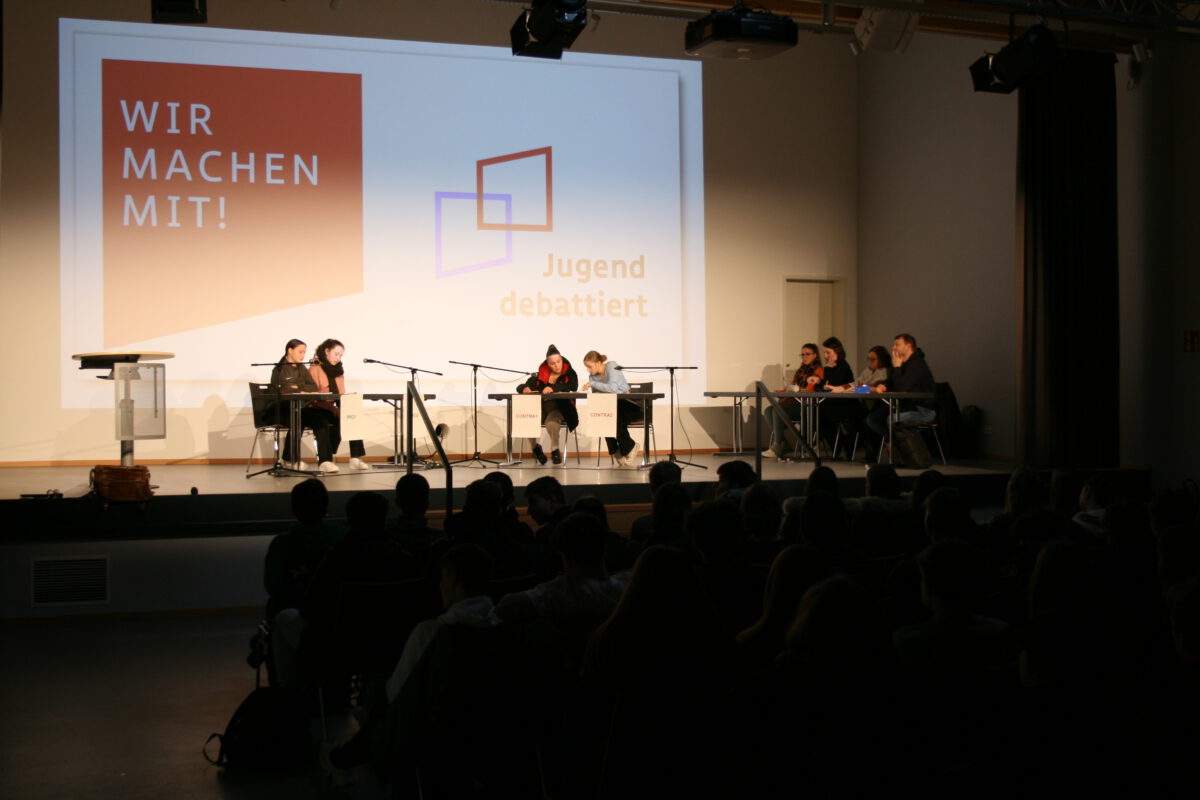 Zuvor hatte es in den Erweiterungskursen des Faches Deutsch Kurswettbewerbe gegeben, aus denen insgesamt acht Finalisten und Finalistinnen hervorgegangen waren, die nun in zwei Runden à vier Debattanten gegeneinander antraten. Thema der beiden Runden waren die Streitfragen „Soll Reiten als Leistungssport verboten werden?“ und „Soll privates Silvester-Feuerwerk verboten werden?“