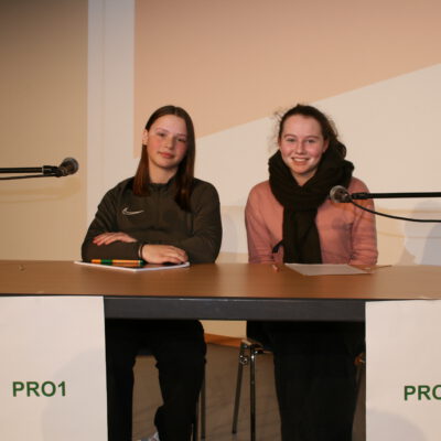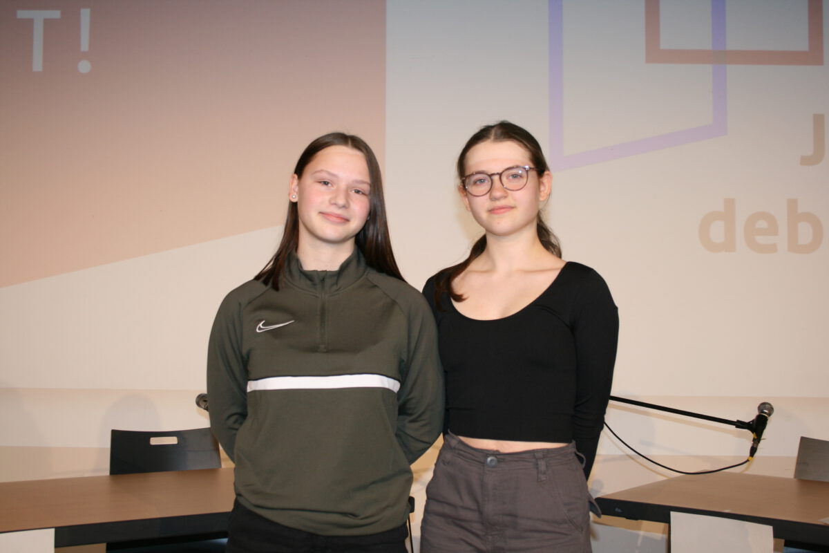 Nele Schoenen (9e) und Franziska Scheins (9b) sind die beiden Siegerinnen des Schulwettbewerbs „Jugend debattiert“, der am Montag zum ersten Mal in der neuen Aula der Europaschule Langerwehe stattfand.