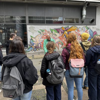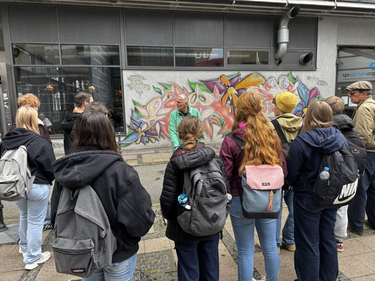 Wieder drehte sich das Programm um das bewährte Thema „Kunst“, das sowohl theoretisch als auch praktisch intensiv bearbeitet wurde: In Aachen setzte sich die Gruppe mit der dortigen Street Art Geschichte auseinander, fachkundig geführt von dem Eheleuten Weinkauf, die sich dort seit 40 Jahren für diese damals noch unbekannte Kunstform einsetzen. Ein weiterer Höhepunkt war der Besuch der Museumsinsel Hombroich, wo nicht nur das tolle Wetter Begeisterung auslöste!