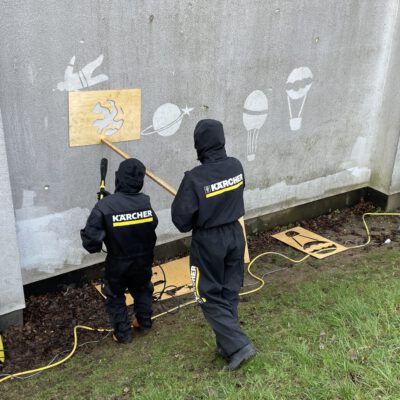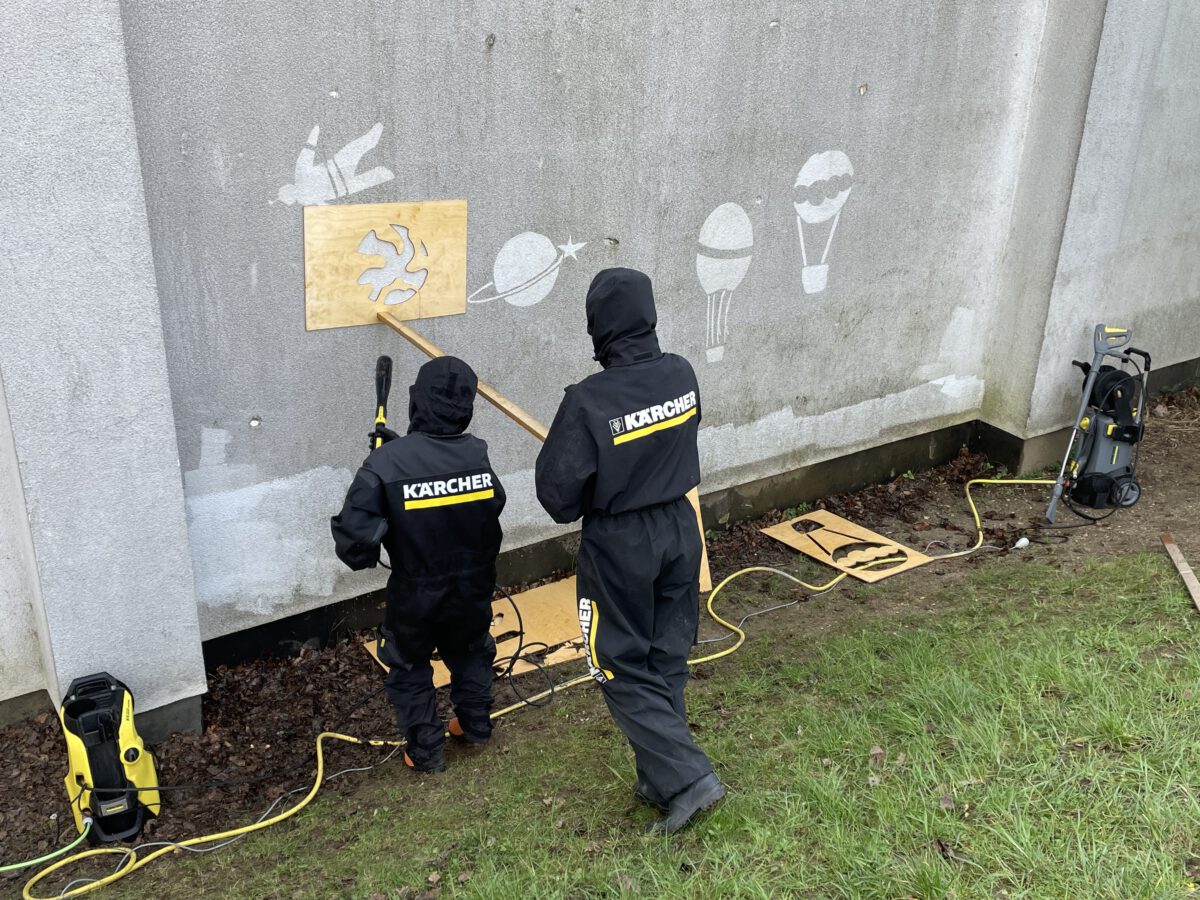 Ihre eigene Kreativität konnten die Schüler sowohl bei einem Comic-Workshop in der Kölner Zentralbibliothek, als auch bei einem Projekt an der Europaschule einbringen. Unter Anleitung ihres Kunst- und Austauschlehrers Klaus Dauven, selbst ein Pionier der „Reverse-Graffiti-Technik“, bei der mit einem Hochdruckreiniger verschmutzte Flächen partiell gereinigt werden, probierten die Schüler erfolgreich die Technik an der „ergrauten“ Wand der Sporthalle aus. Mit selbstgestalten Schablonen, sogenannten „stencils“ kreierten sie spielerisch einen Blick in den Himmel mit Heißluftballons, Raketen und Planeten. Nur Polarlichter gibt es auf der Wand keine, aber dafür sind für dieses Wochenende, das die schwedische Gruppe wieder in Stockholm verbringen, in der Eifel wieder welche in „echt“ angesagt.