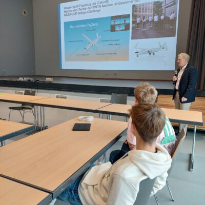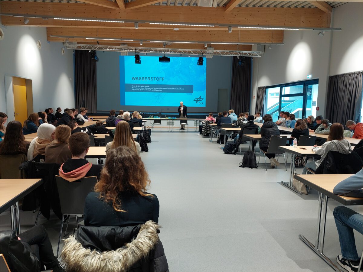 Prof. Dr. Christian Sattler, der als letzter Hauptreferent an das Rednerpult trat, freute sich, dass er nun die Gelegenheit hatte, auch die jüngste Generation von angehenden Wissenschaftlern und Auszubildenden mit seinen Visionen zum Thema „Grüner Wasserstoff“ zu erreichen. Er sehe sich in der Pflicht, sie darüber aufzuklären, was Wasserstoff als Energieform der Zukunft bringen und wie man mit Berufen rund um den Wasserstoff seine Karriere aufbauen könne. Hierzu biete die Region Düren ausgezeichnete Voraussetzungen, nicht nur für angehende Studierende an der RWTH Aachen oder am Forschungszentrum Jülich sondern eben auch für Auszubildende in Handwerksberufen. Viele Firmen in der Region suchten studierte und ausgebildete junge Menschen, z.B. in den Bereichen Mobilität, Ressourcen oder Luft- und Raumfahrt.