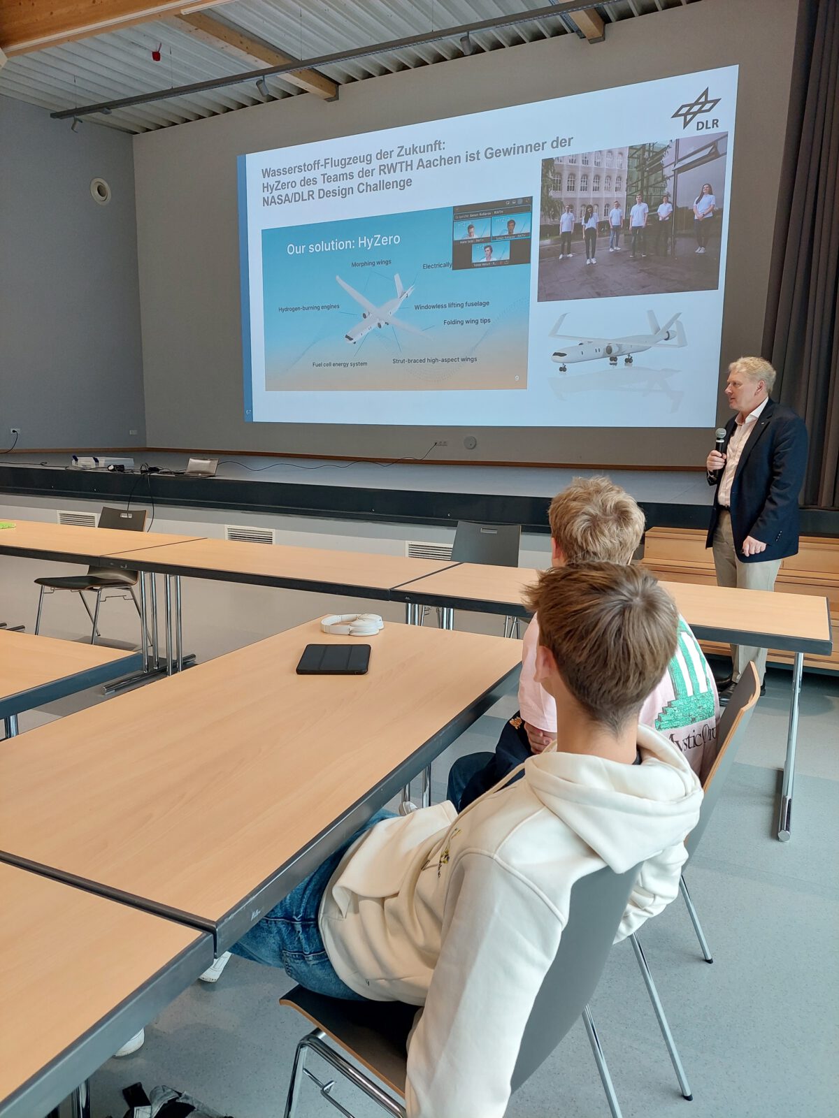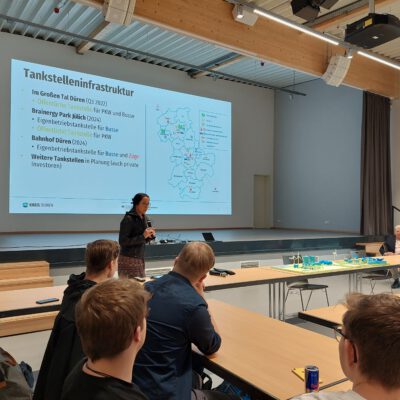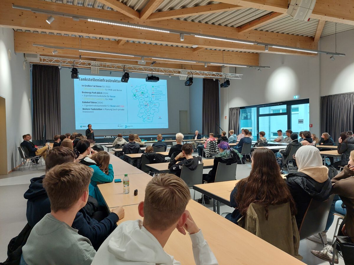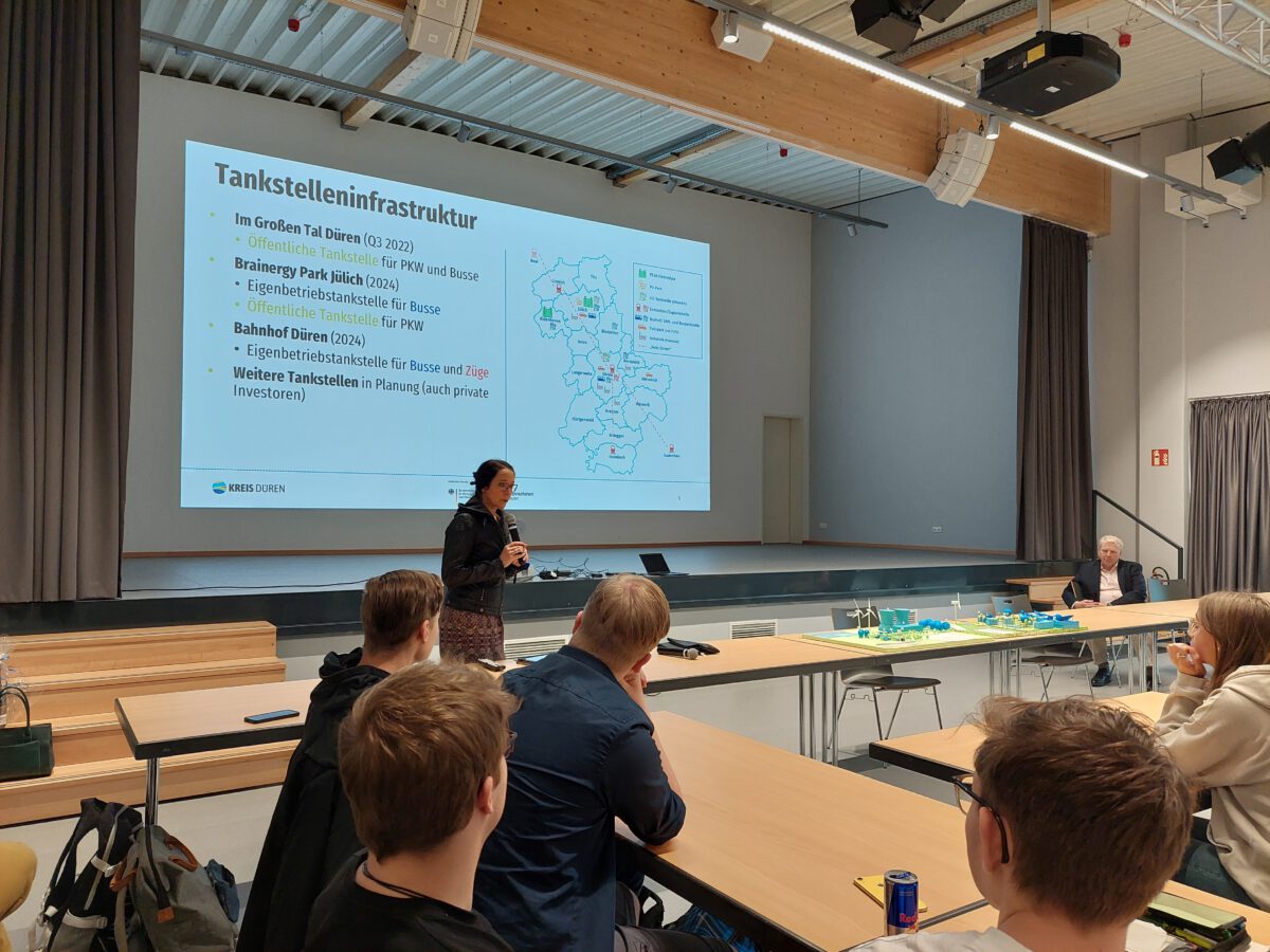 Im Anschluss an Schüsslers Vortrag stellte der Q2-Projektkurs seine Arbeit vor und berichtete von der Teilnahme an mehreren Veranstaltungen wie der Jülicher Messe und ihrem Projekt an der Schule, dass sowohl von ihren Lehrerinnen Janine Dassen und Wiebke Gerhardt als auch von den Mitarbeitern des Wasserstoff-Kompetenzteams des Kreises Düren, Frank Burkard und Marius Richter, betreut wurde. Die beiden hatten den Projektkurs das ganze Schuljahr über begleitet und einmal im Monat an der Schule mit den Schülerinnen und Schülern zum Thema Wasserstoff gearbeitet, z.B. zu der Frage, wie der „Grüne Wasserstoff“ im Kreis Düren verteilt werden könne.