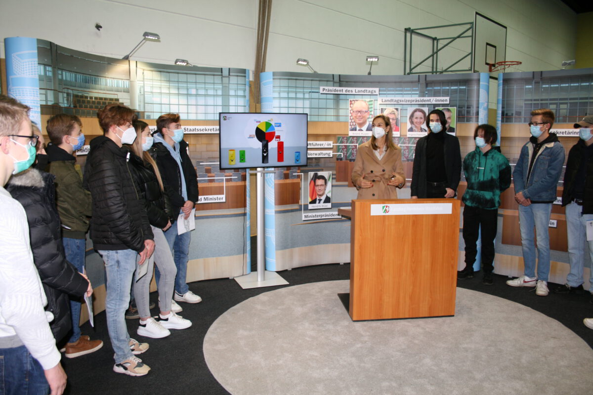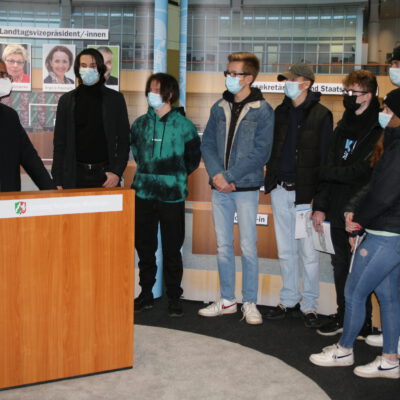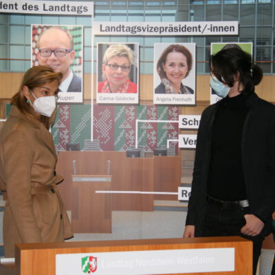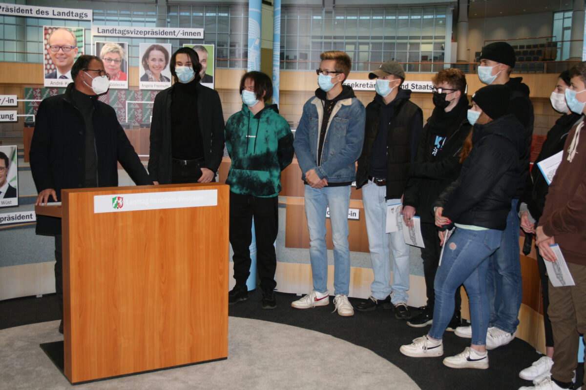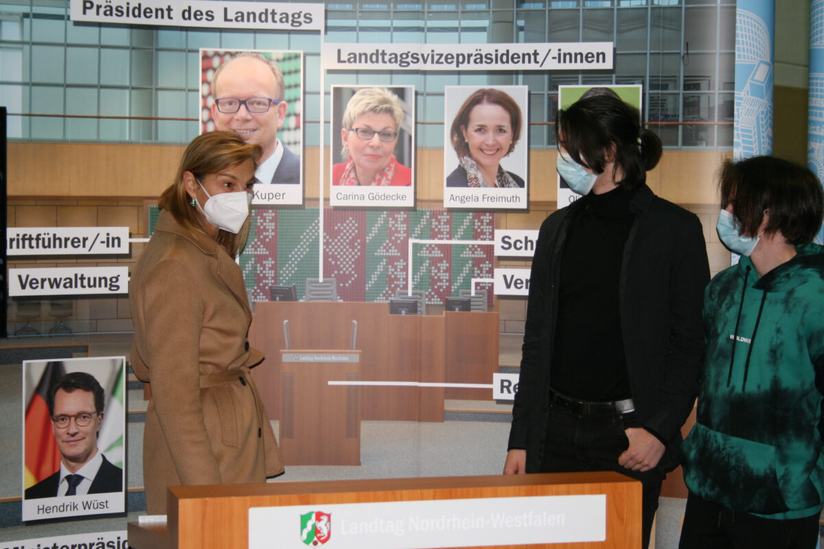 Zu Gast waren auch Isabel Hohmann und Saskia Niemetz vom Sachbereich Schülerprogramme und Jugendparlament im Landtag NRW, die an der Konzeption der Ausstellung maßgeblich beteiligt waren, der Deutschkurs der Jahrgangsstufe EF von Referendarin Laura Lucia Leistekow sowie ihre Geschichts-Kollegin Annette Jecker, die die Ausstellung an die Schule geholt hatte.